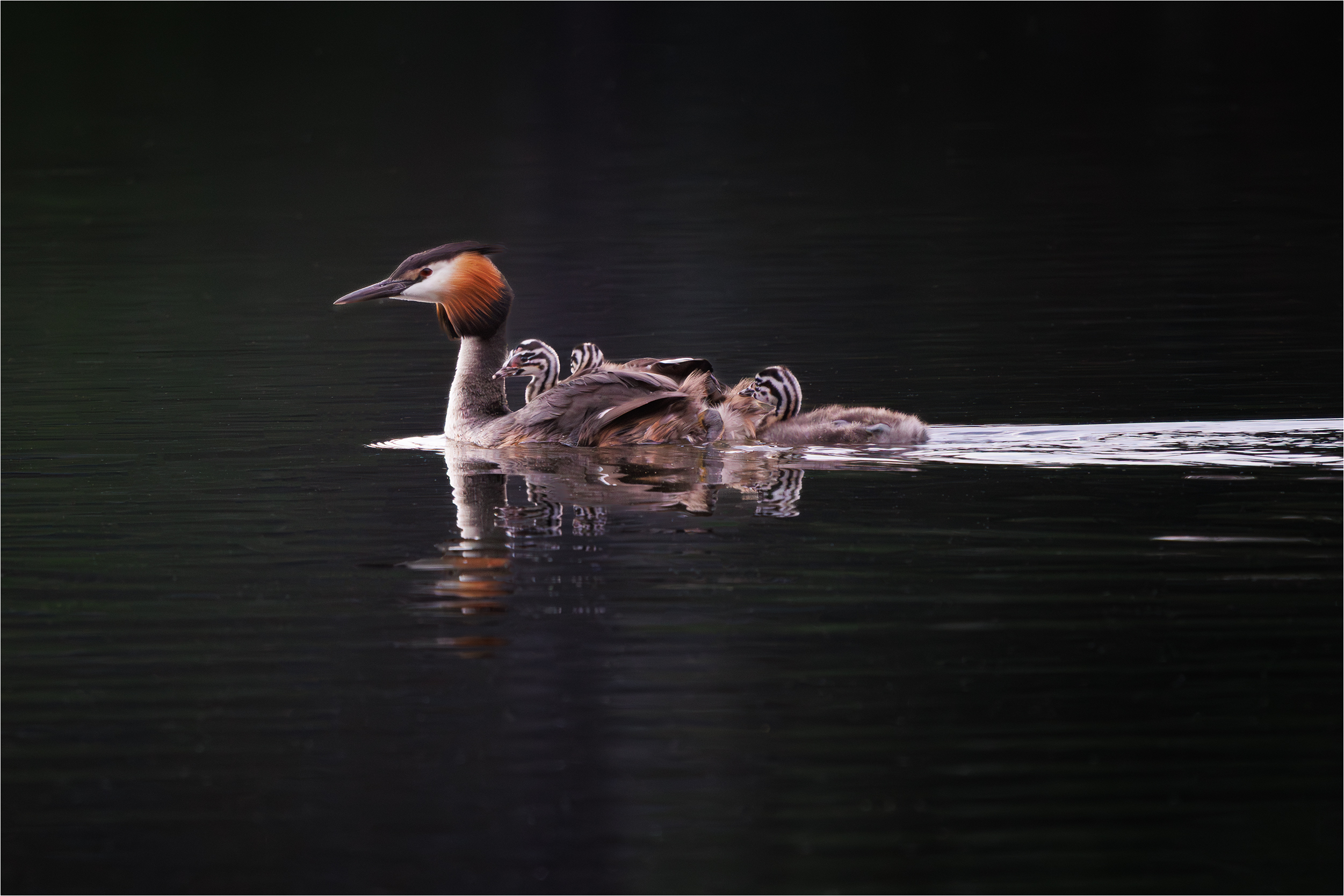 Jag hade fått ett tips om att ett skäggdoppingpar hade ungar så jag gick runt med hunden Fia (min ständiga följeslagare) och letade vid sjön..Det var alltid två som fick åka på mammas rygg och den tredje fick simma själv.