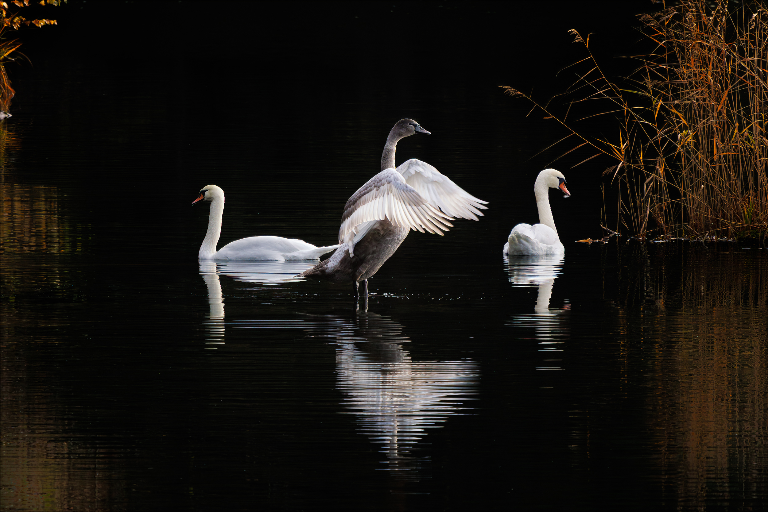 Jag har följt knölsvansfamiljen i den närbelägna sjön under sommaren och hösten. I somras hade de två ungar men plötsligt var en unge borta....jag pratade med några som sett en havsörn över sjön och efter det var ungen borta. Här är bilder från slutet av oktober när vattnet var stilla och morgonsolen lyste upp svanfamiljen mot de mörka vattnet. Här ser man tydligt hur svanungen påbörjat sin förvandling till vuxen svan. När den sträcker på vingarna ser man tydligt hur mycket vita fjädrar den redan har. Än så länge är svanungen inte flygfärdig men den tränar hela tiden