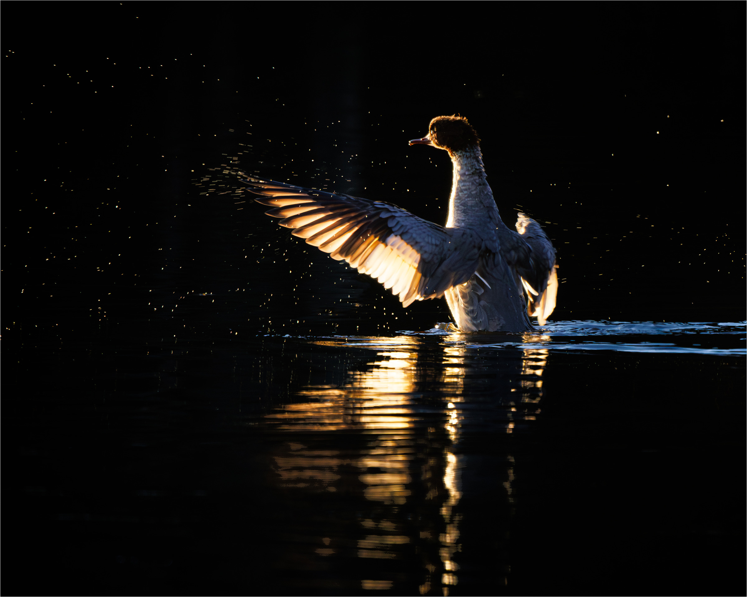 Jag hade turen att få träffa storskakarna några fina novembermorgnar.....Här en storskrakehona som skakar av sig upplyst av morgonsolen mot det mörka vattnet i bakgrunden
