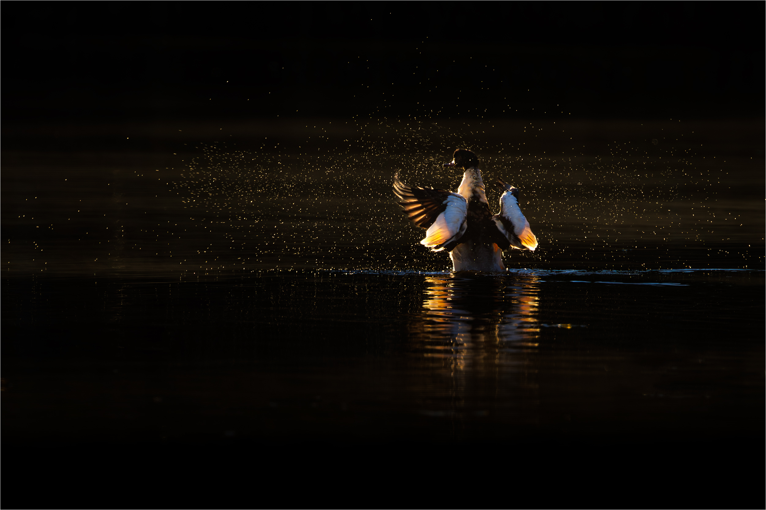 En novembermorgon med stilla vatten och lågt stående sol. Storskrakehanen sträcker på sig och skakar av sig vattnet i det magiska ljuset. Troligen flyttade de några dagar senare.....